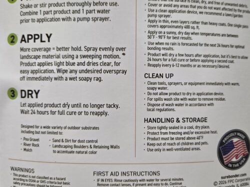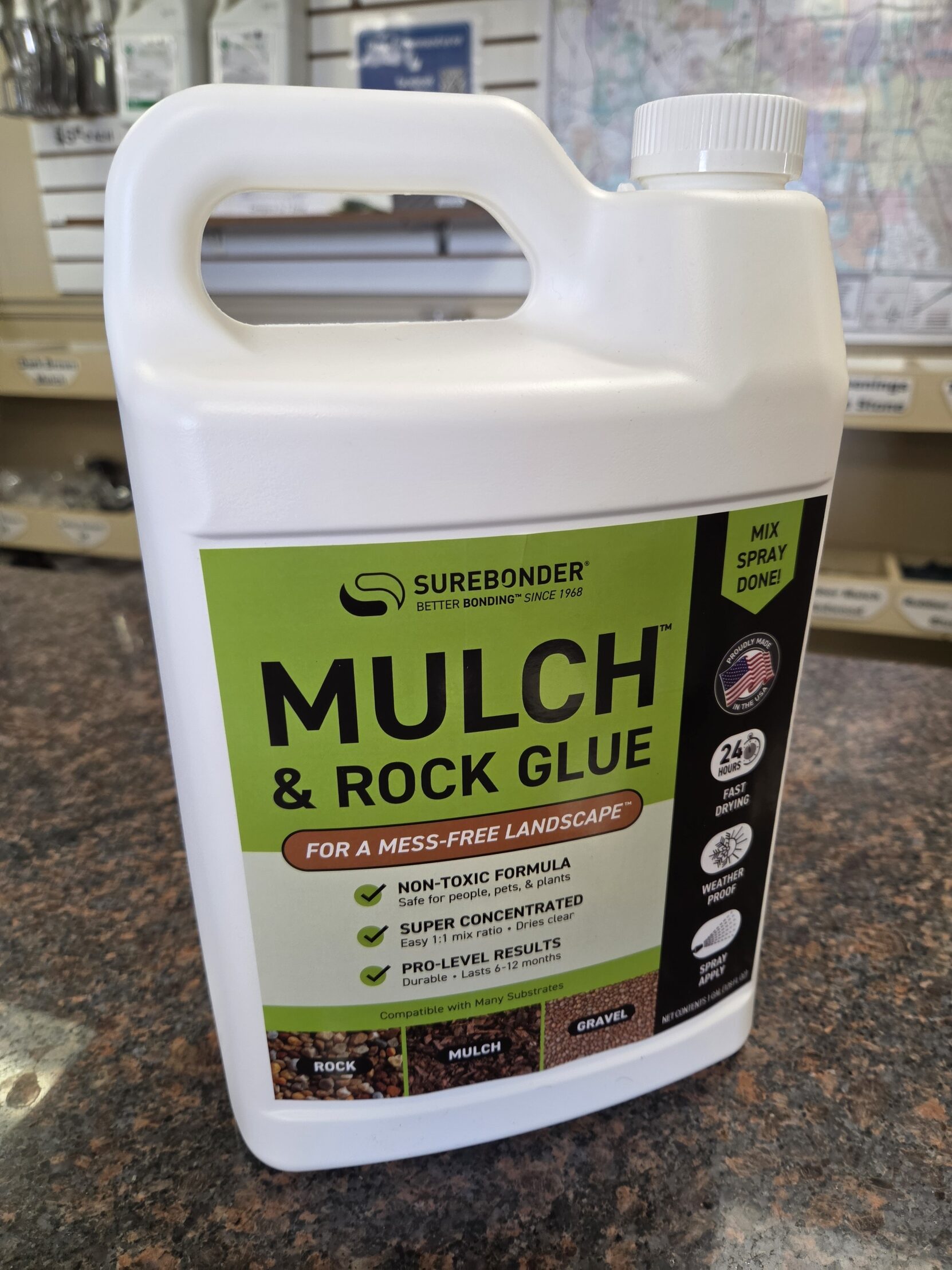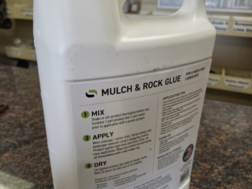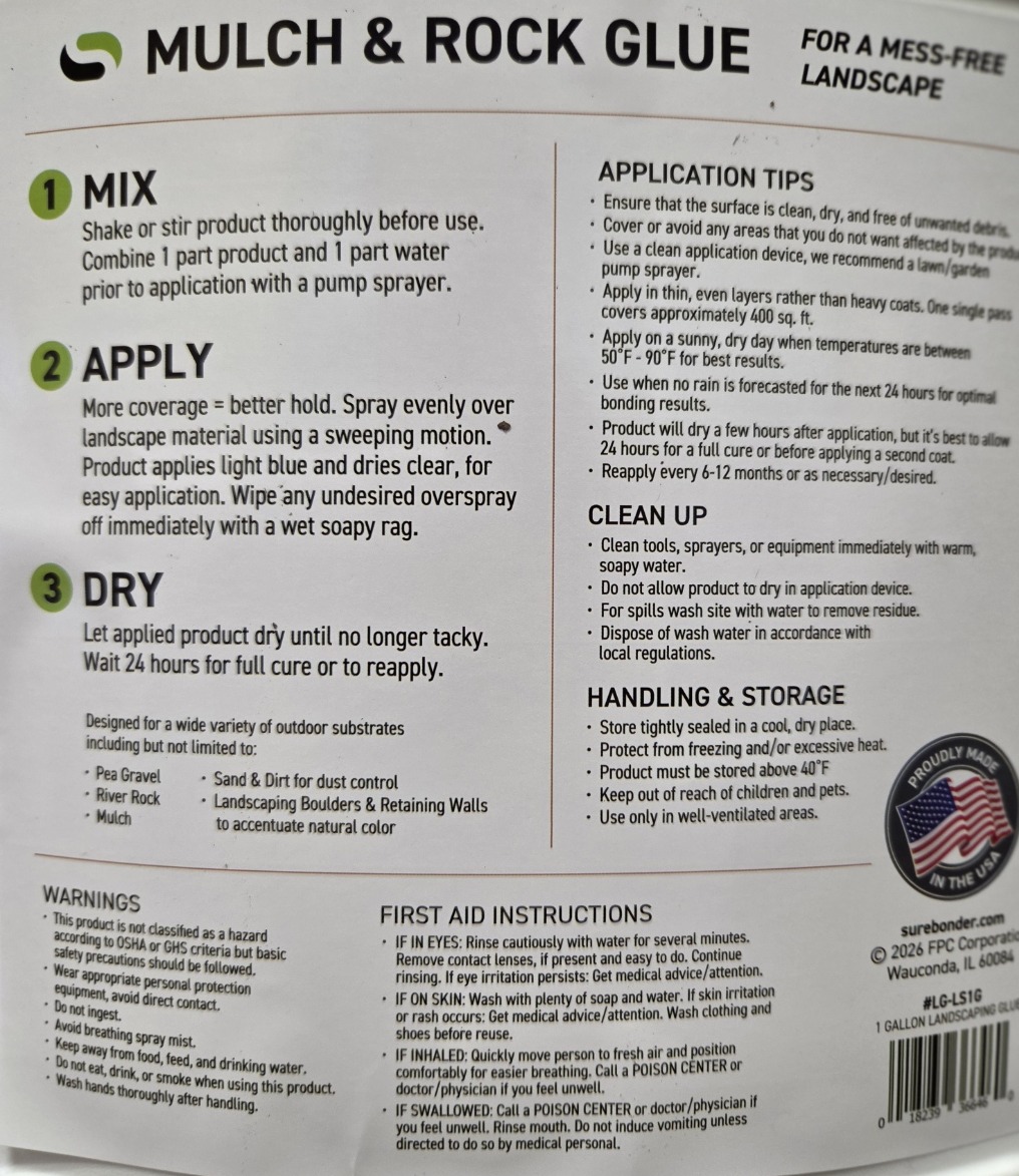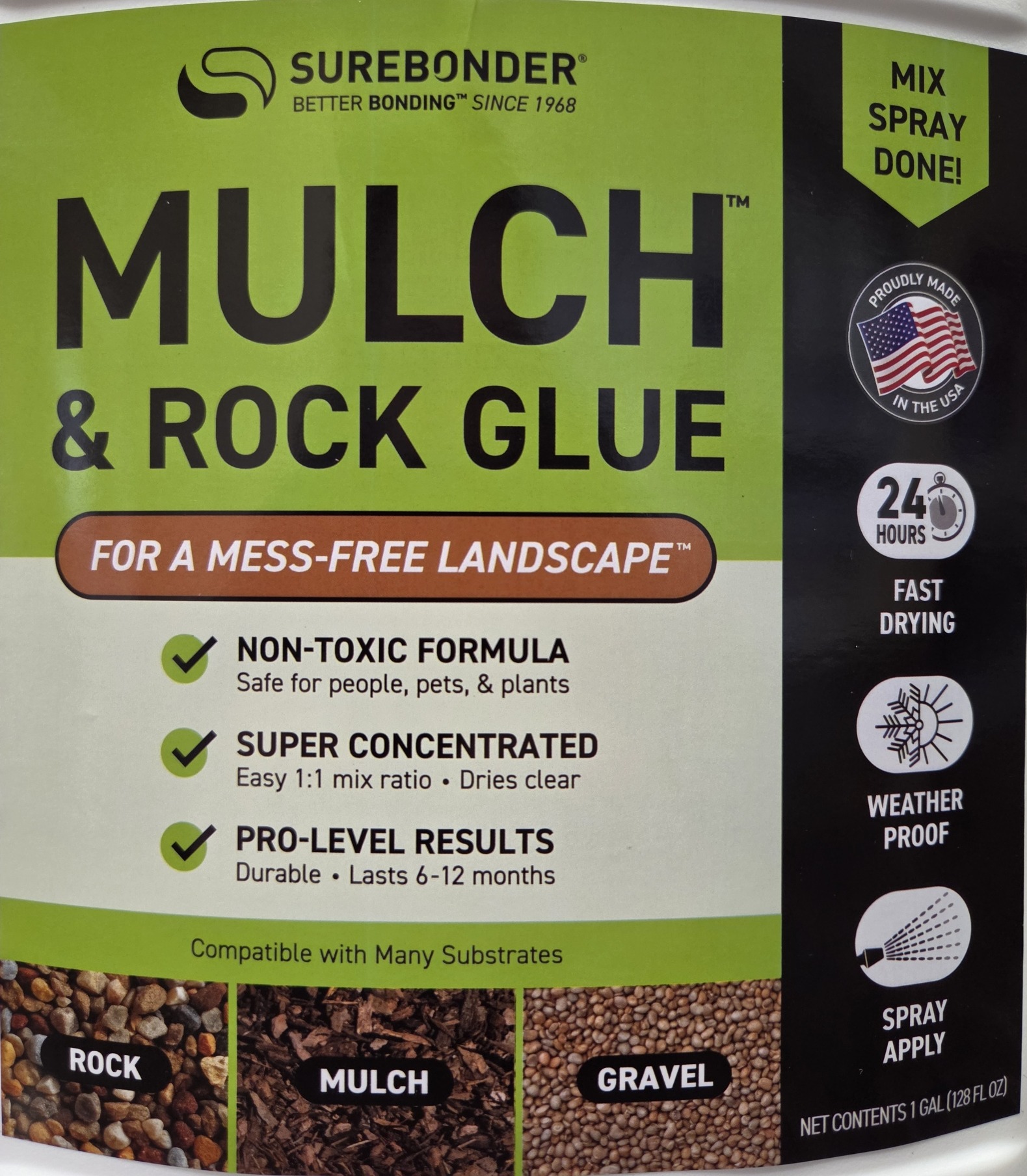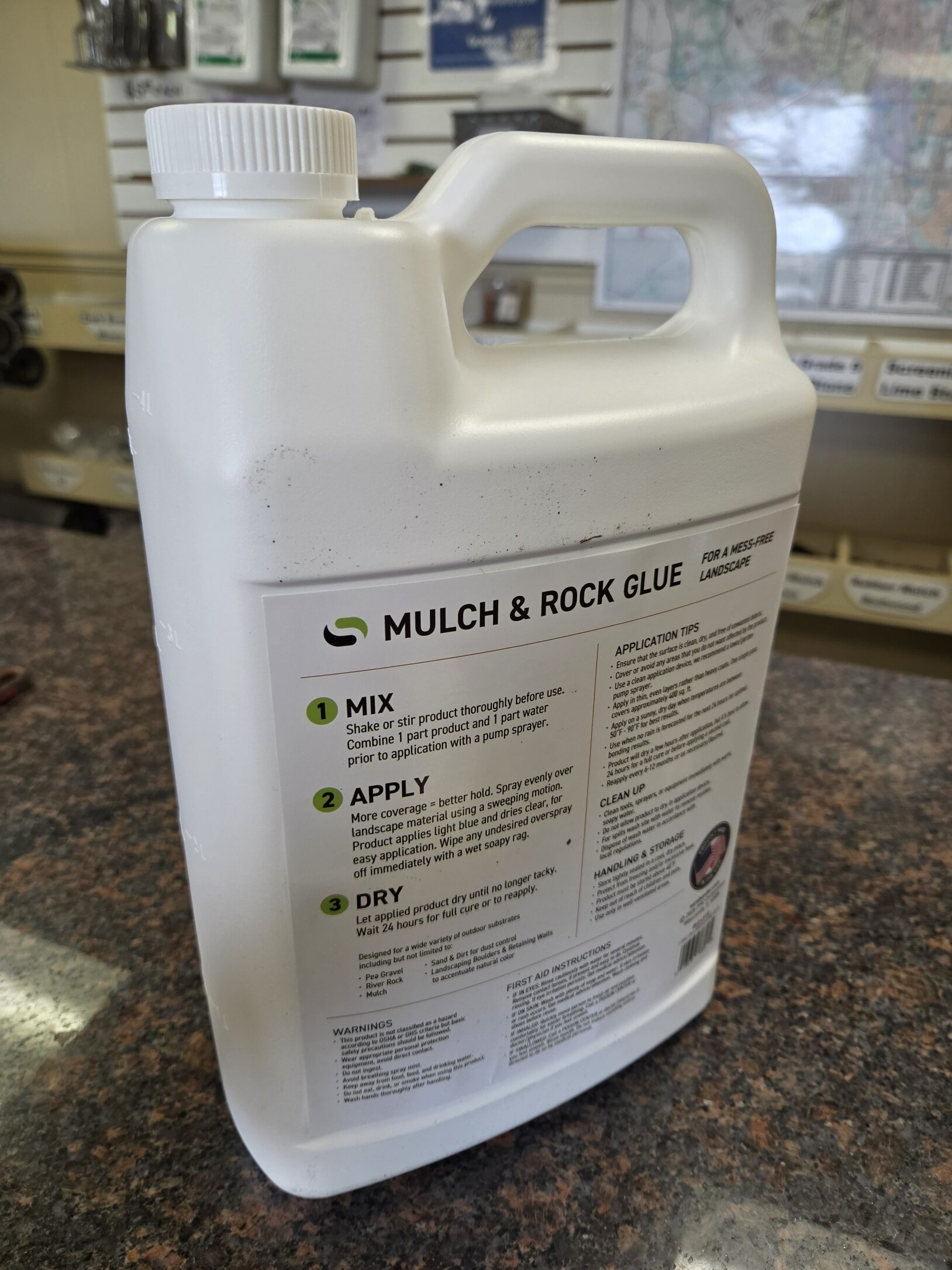 1 Gallon Bottle. Mix 1:1 Mulch Glue concentrate to water. Covers 400 sqft per bottle in 1 pass. Apply to mulch or stone.1-2 applications recomended depending on use case. Great for downspot areas, pitched/hilly areas or anywhere you want mulch and stone to stay. Sprays on blueish/white and dries clear. Makes stone a glossy “wet look” when cured. Read directions on bottle prior to use. Clean applicator sprayer thoroughly after use. Made in USA.